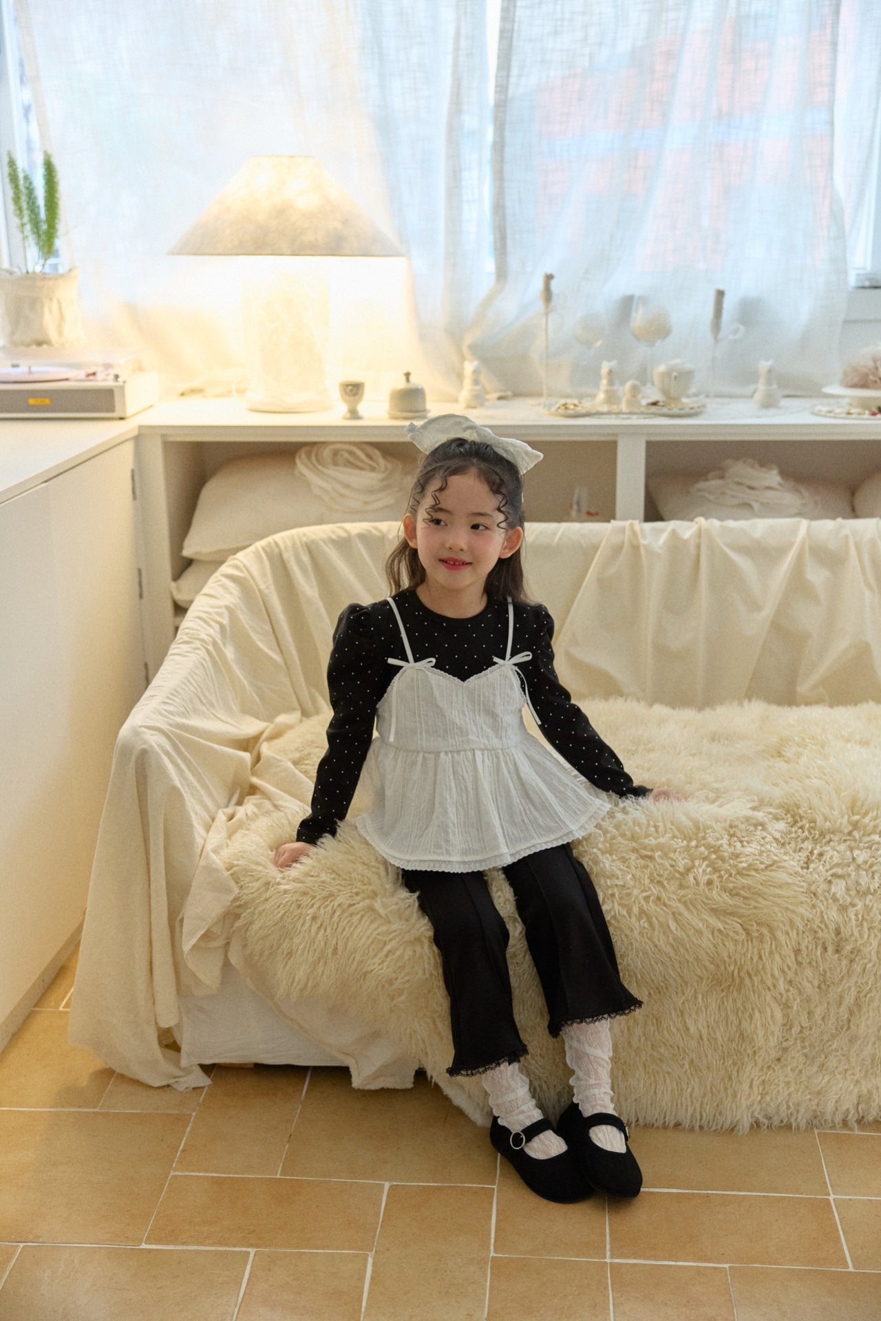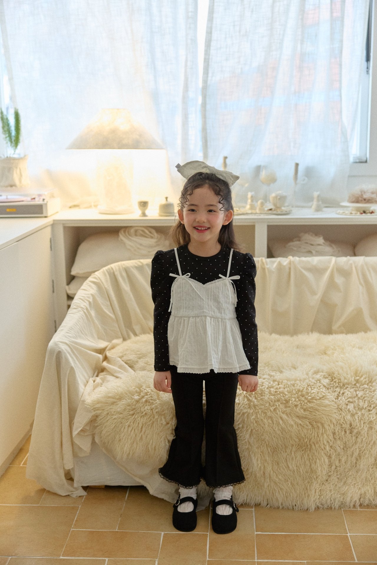 精緻、典雅,風格帶點法式與韓系融合的感覺 —— 雙層上衣設計、微喇叭褲、蝴蝶結點綴,整體溫柔又俏皮。